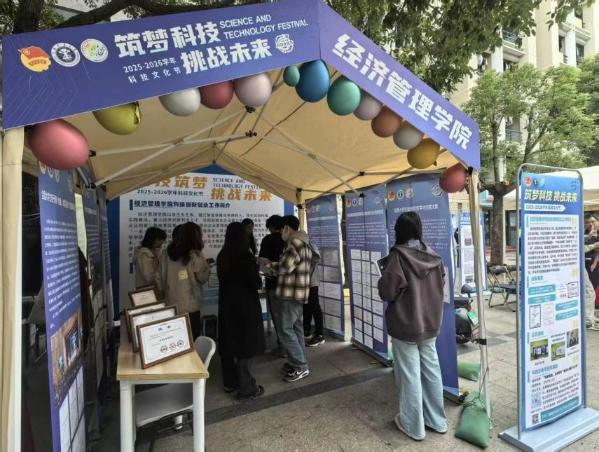 为搭建科创育人平台,浓厚校园双创氛围,学院于2025年10月29日在青创广场参展科技文化节,经济管理学院大学生科学技术协会负责本次展位布置和策划。