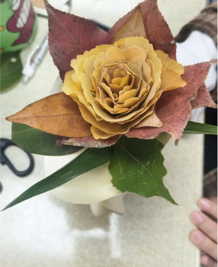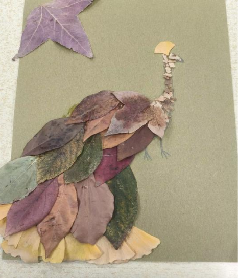 活动流程主要分为活动讲解与实物制作。在活动开始,团支书孙湘涵向同学们讲述了此次活动的背景与目的。之后,同学们开展了实践创作。或个人独立创作,或2-3人小组合作,用落叶拼贴诗歌、插画等作品。通过自己的奇思妙想与巧手,枯黄的落叶在同学们的努力下仿佛拥有了第二次生命。最后,部分同学介绍作品的创作思路与感悟。