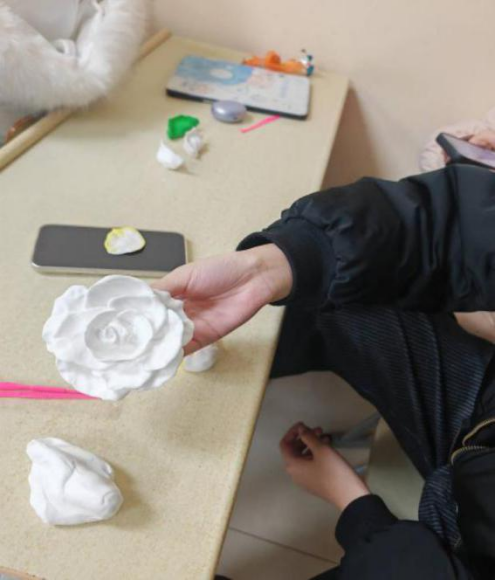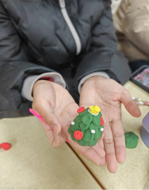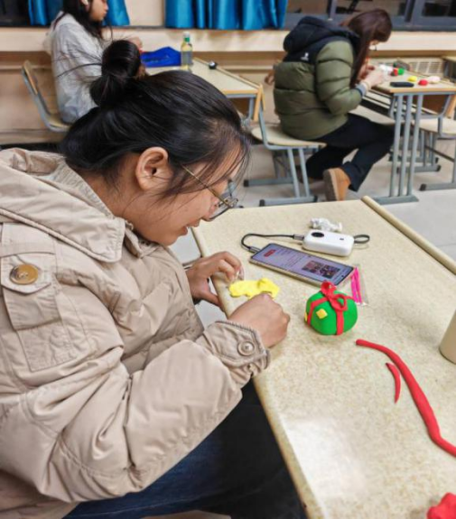 活动现场气氛温馨活泼,同学们在志愿者的指导下,充分发挥想象力与创造力,将一团团朴素的粘土逐步塑造成形态各异、生动有趣的作品。圣诞树、花朵、动物……一件件充满个性的作品在指尖悄然绽放,展现了同学们细腻的观察力和灵巧的动手能力。活动中,大家互相交流制作心得,分享创作灵感,在协作与欢笑中提升了团队凝聚力,也缓解了日常学习的压力。