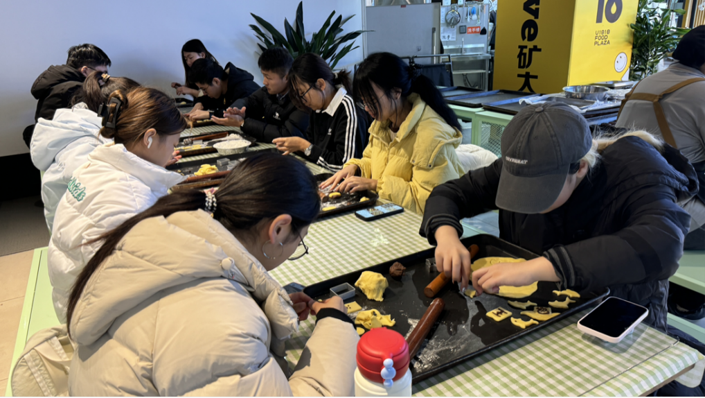 下午两点,同学们准时集结于活动场地。徐家铺子提前备好面粉、糖、黄油等新鲜食材及烤盘、擀面杖等器具。随后,活动负责人与店铺工作人员详细讲解了饼干制作流程、卫生要求及安全注意事项。讲解结束后,同学们分组协作、动手创作,揉面、塑形、创意设计各环节有条不紊,大家自由发挥打造专属饼干造型与口味,过程中互帮互助、交流技巧,现场充满欢声笑语。