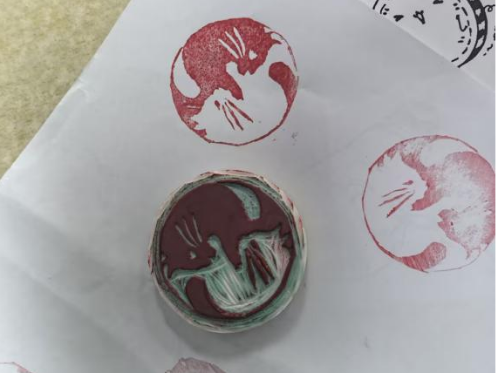 下午3:30,班干部提前布置活动场地,清点并摆放好橡皮砖、刻刀、印泥、铅笔、草稿纸等活动材料。同学们到齐并签到后自行领取材料、自主选择喜爱的图案进行临摹勾勒,再手持刻刀小心翼翼地进行雕刻。过程中,同学们通过学习不同的雕刻技巧不断在橡皮有限的区域内绘制无限的想象力,同时观看教学视频解决遇到的难题,经过两个小时的创作,一幅幅独具特色的橡皮章作品完成,学生们纷纷用印泥拓印自己的作品,相互展示交流。活动最后,志愿者引导学生整理活动场地、拍照留念,将工具材料分类收纳。