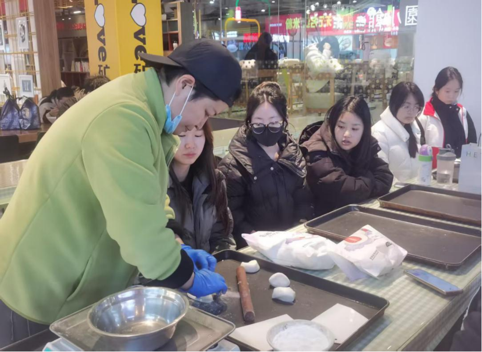 下午4时,全体同学在徐家铺子集合完毕后,店铺工作人员先为大家讲解雪媚娘的制作要点与操作技巧。随后同学们分组协作,动手完成揉制糯米皮、填充奶油与馅料、塑形包装等步骤,在实操过程中熟悉雪媚娘的制作流程。活动中,同学们相互交流制作心得,现场氛围轻松愉悦,大家都沉浸在手工制作的乐趣中,最终均完成了属于自己的雪媚娘作品。