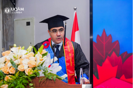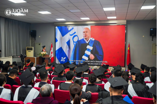 典礼在中加两国国歌声中拉开序幕。加拿大魁北克大学蒙特利尔分校校长Stephane Pallage教授通过视频致辞,向2025届毕业生致以热烈祝贺,高度肯定他们在职完成学业的坚韧付出,寄语毕业生以所学知识贡献社会,祝愿事业生活双丰收,并期盼两校友谊历久弥新。