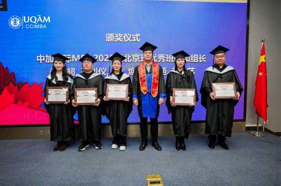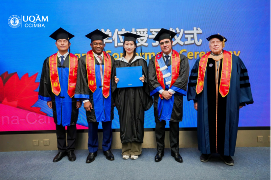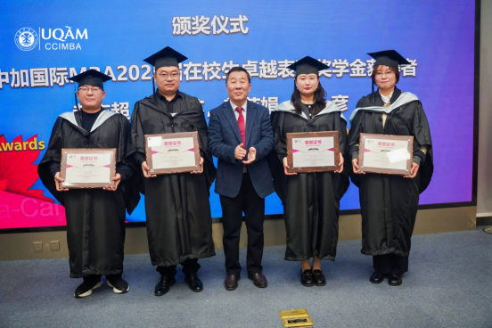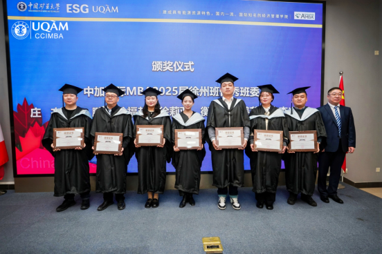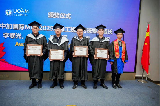 加拿大魁北克管理学院院长Komlan Sedzro教授、中国矿业大学经济管理学院院长丁志华教授 、加拿大魁北克大学 EMBA项目主任Kamal Bouzinab教授、加拿大魁北克大学那士荣教授和为中加国际MBA2025届学员授予学位。