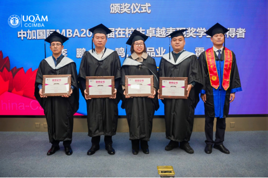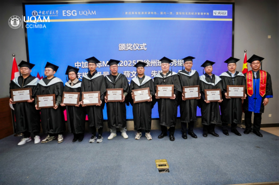 接下来,中国矿业大学经济管理学院党委书记李新春、院长丁志华、国际合作交流处副处长权学红、副院长冉洪涛、国际事务办公室主任王帮俊、学科与人才工作办公室主任陈飞宇为中加国际MBA2025届在校生卓越表现奖学金获得者和优秀班委颁发证书。