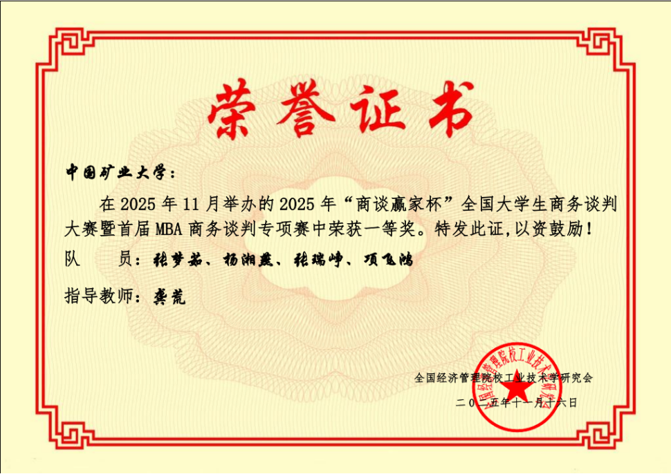 11月9日,2025年“商谈赢家杯”全国大学生商务谈判大赛暨首届MBA商务谈判专项赛在长安大学落下帷幕。我校经济管理学院张梦茹、杨湘燕、张瑞峥、项飞鸿4位同学组成的谈判团队参与了本次大赛,在龚荒老师的指导下,于全国200多支高校参赛队伍中脱颖而出,获得国赛一等奖。