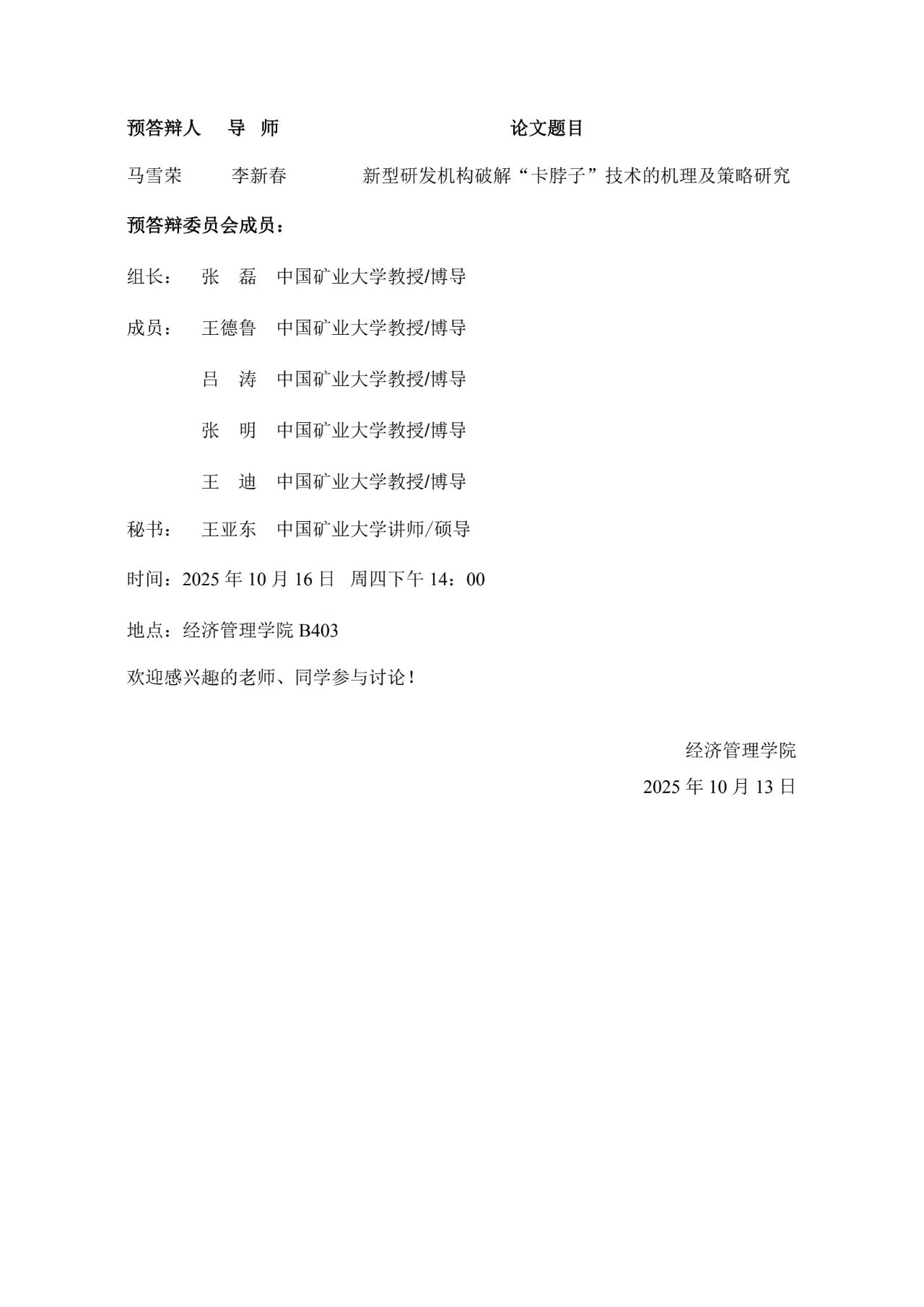 2025年下半年管理科学与工程专业博士学位论文预答辩通告(二)