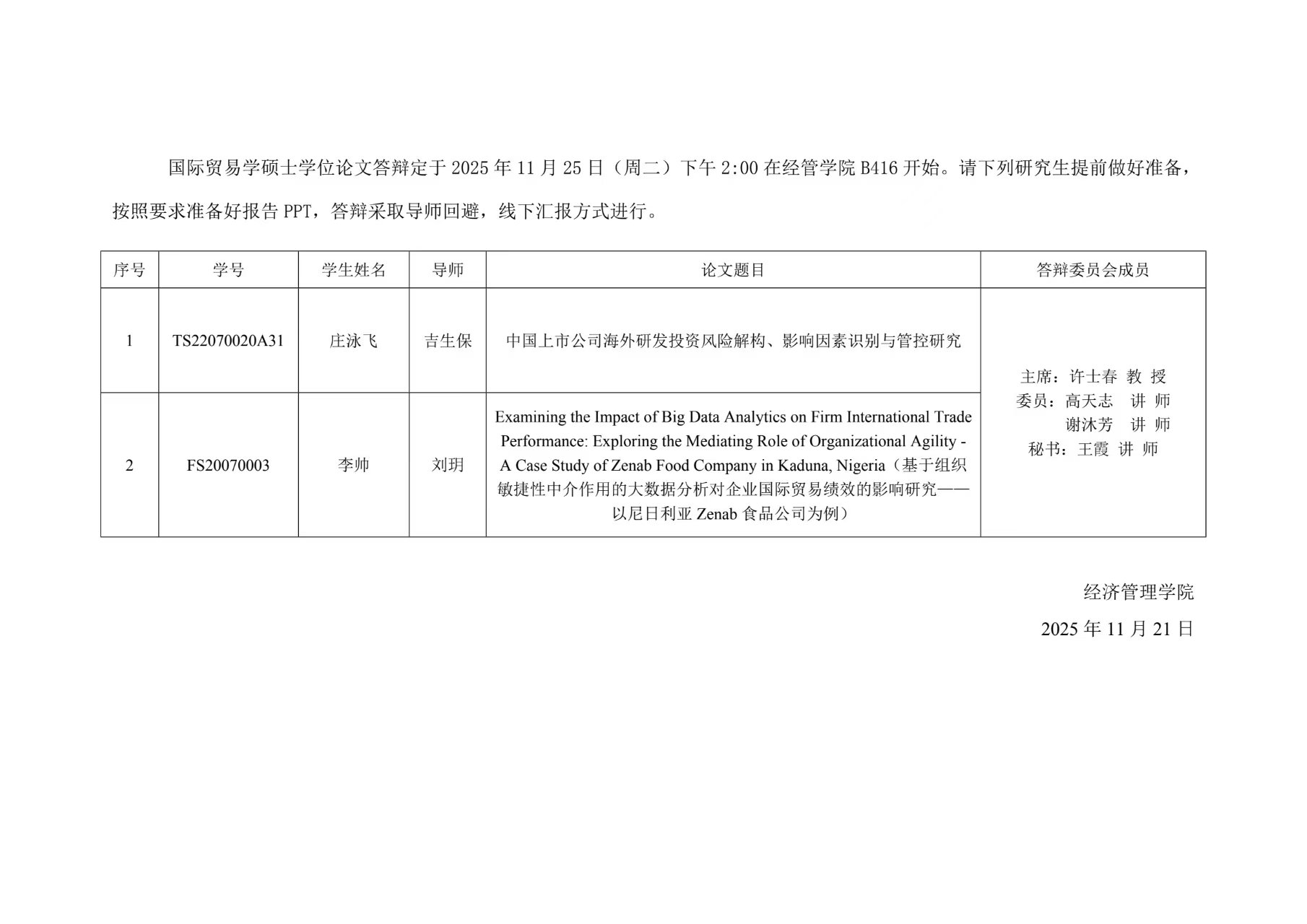 2025年下半年国际贸易学硕士学位论文答辩通告