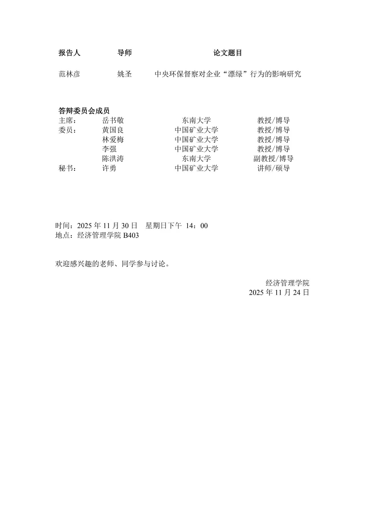 2025年下半年财务管理系统工程专业博士学位论文答辩通告(二)