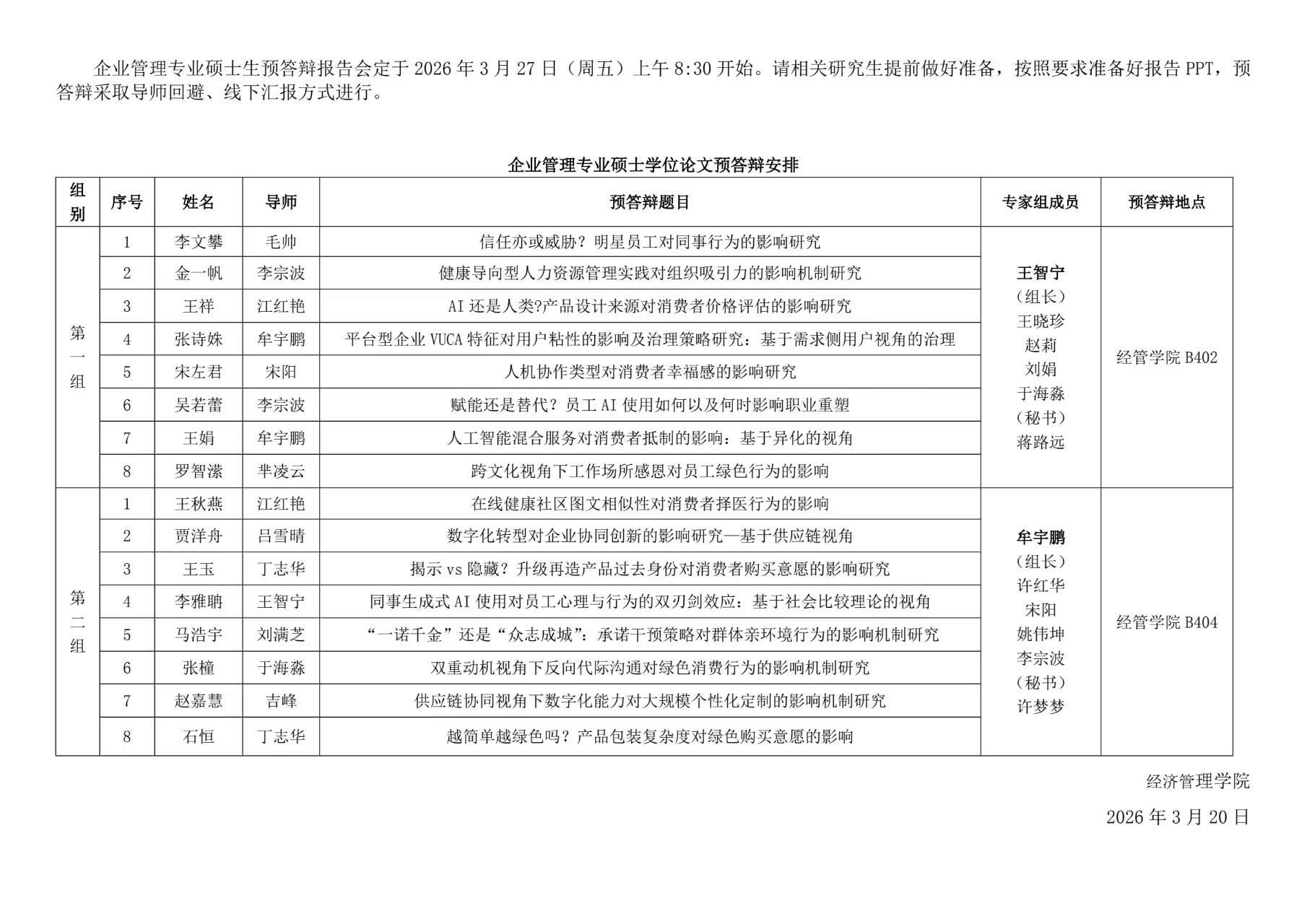 2026年上半年企业管理专业硕士学位论文预答辩通告