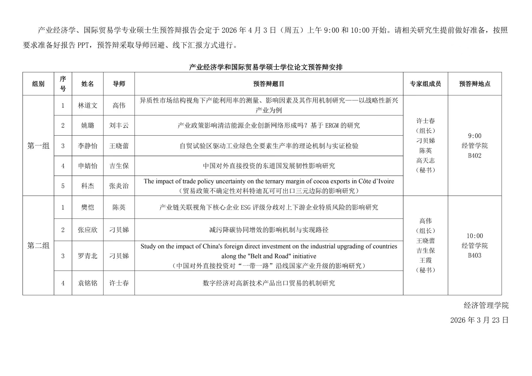 2026年上半年产业经济学、国际贸易学专业硕士学位论文预答辩通告