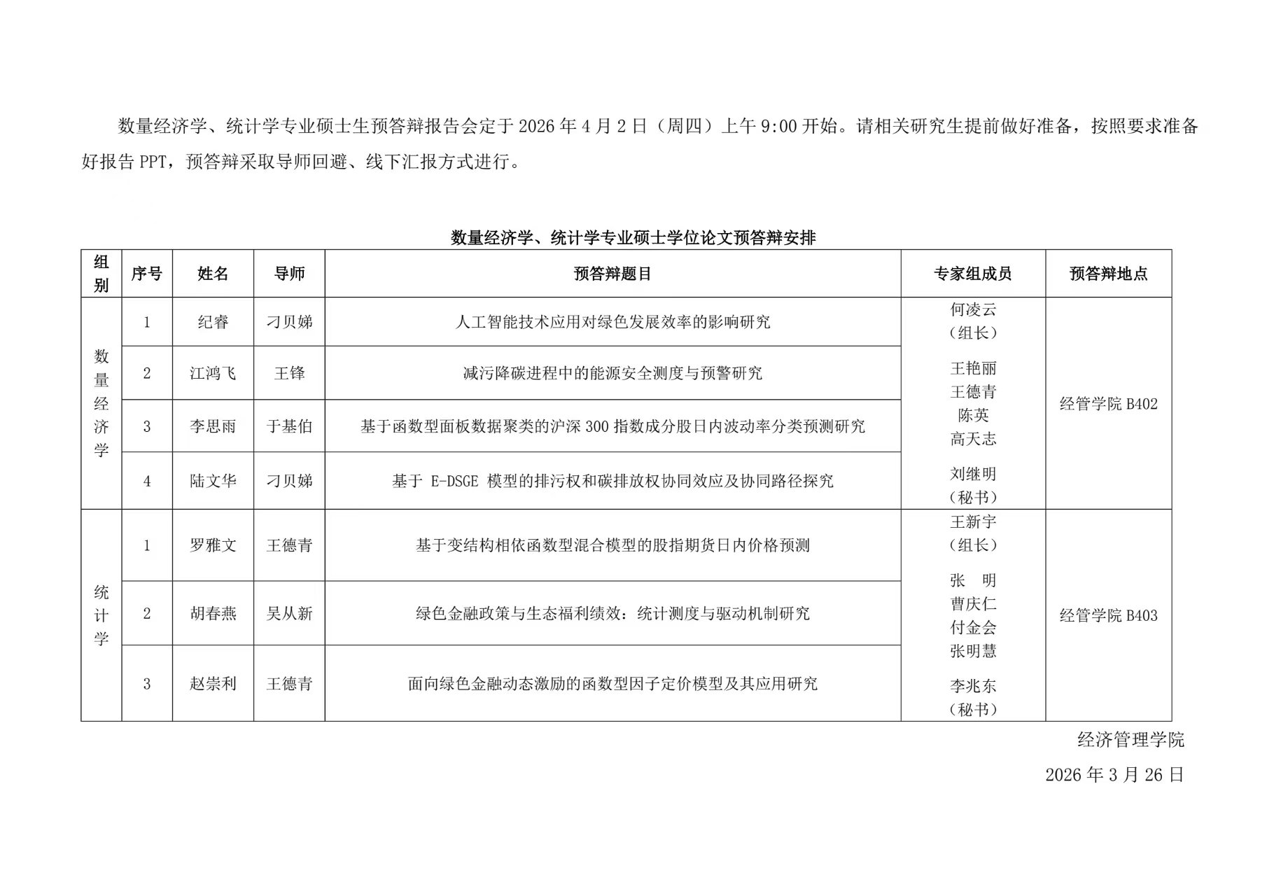 2026年上半年数量经济学、统计学专业硕士学位论文预答辩通告