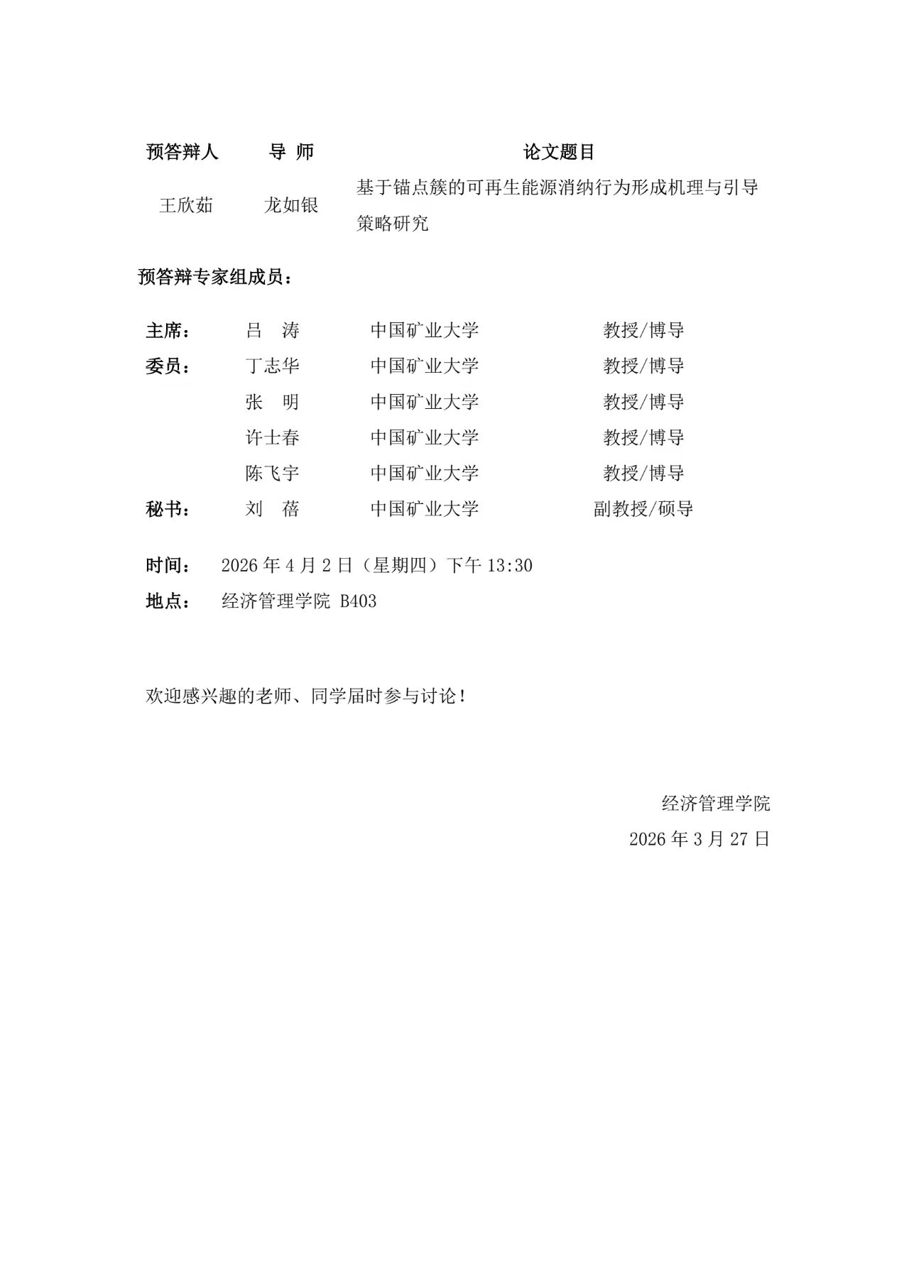 2026年上半年管理科学与工程博士学位论文预答辩通告(四)