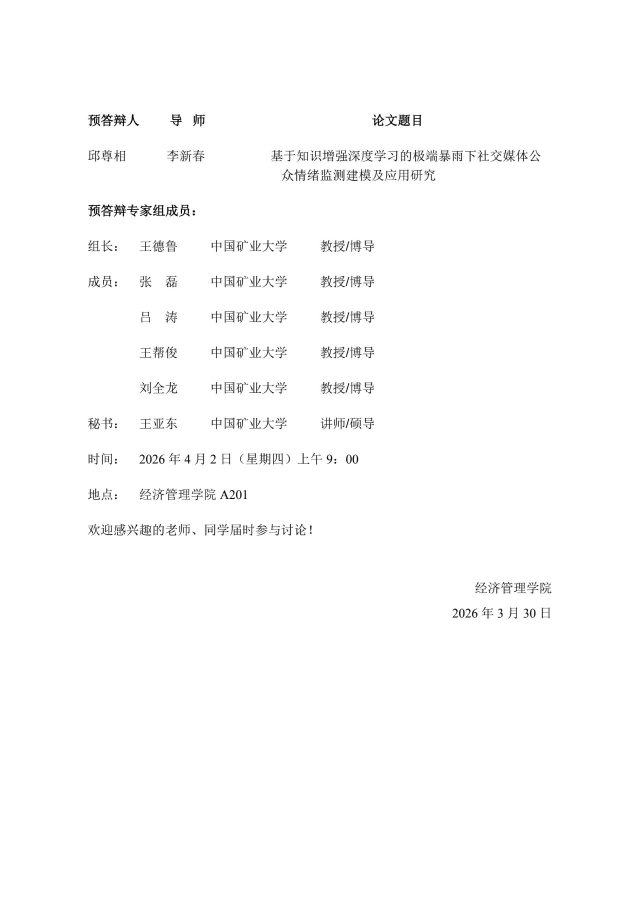 2026年上半年管理科学与工程博士学位论文预答辩通告(八)