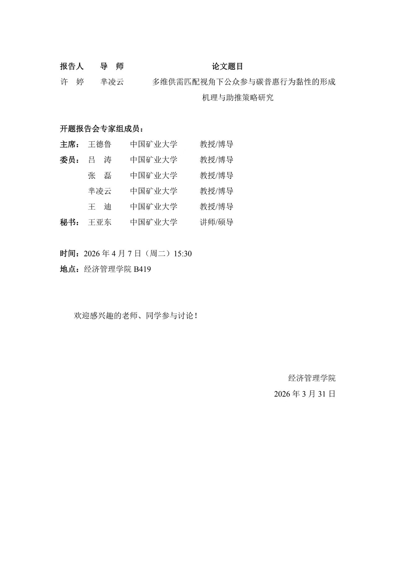 2026年上半年管理科学与工程博士学位论文预答辩通告(十)
