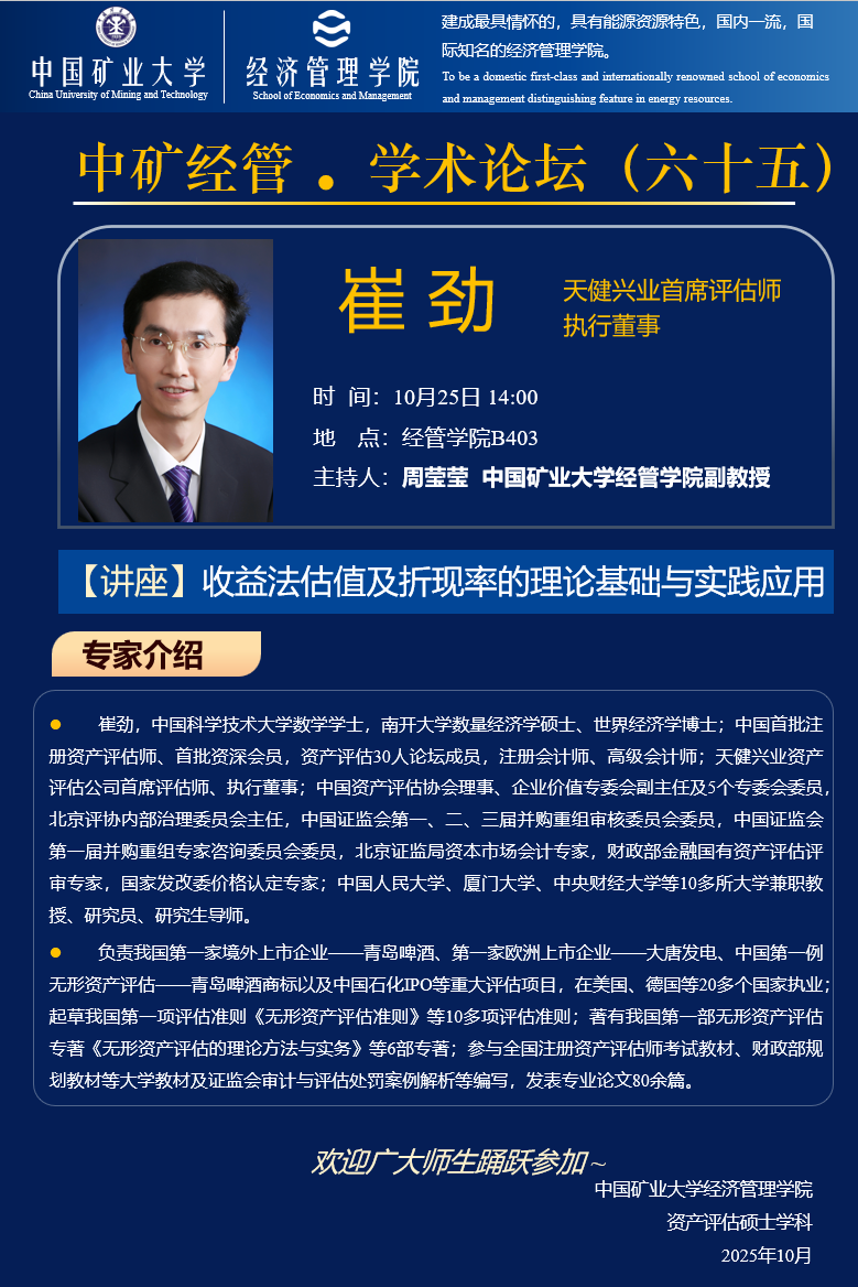 10月25日 中矿经管·学术论坛(六十五): 收益法估值及折现率的理论基础与实践应用