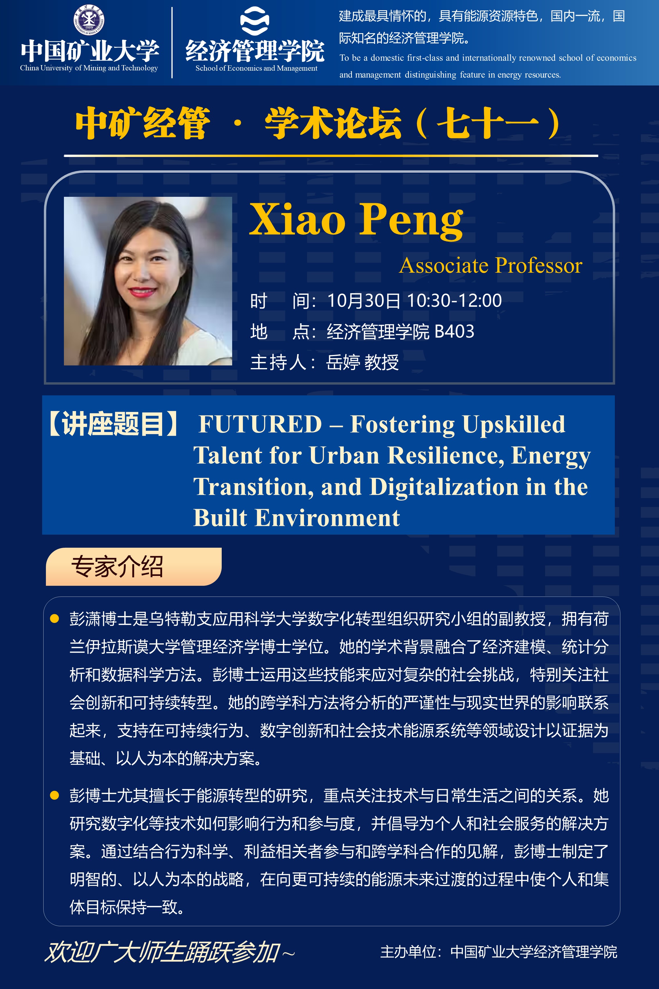 中矿经管·学术论坛(七十一)FUTURED – Fostering Upskilled Talent for Urban Resilience, Energy Transition, and Digitalization in the Built Environment