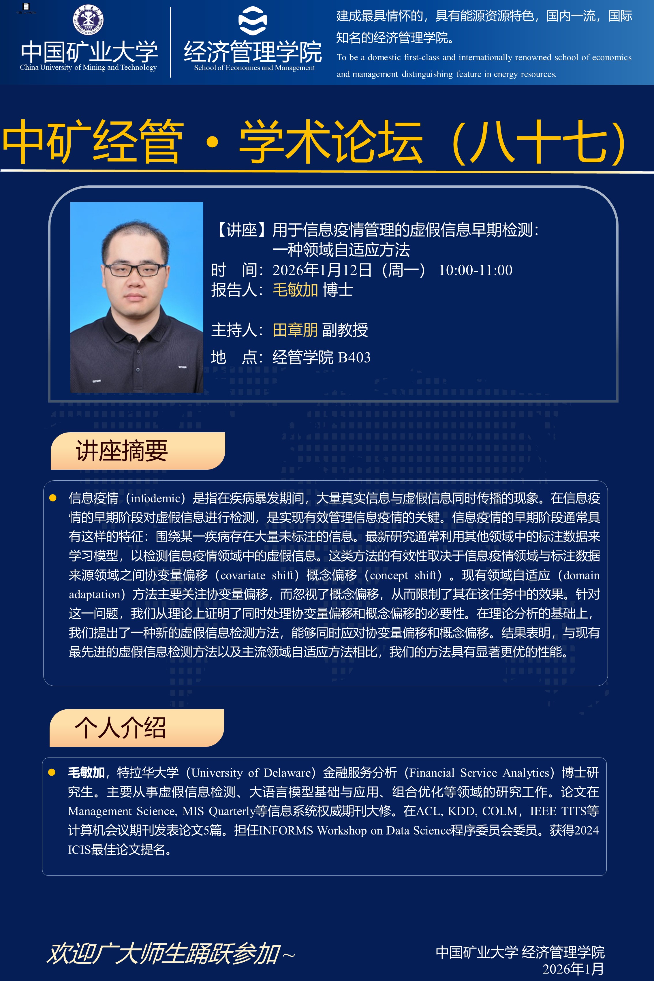 中矿经管·学术论坛(八十七):用于信息疫情管理的虚假信息早期检测:一种领域自适应方法